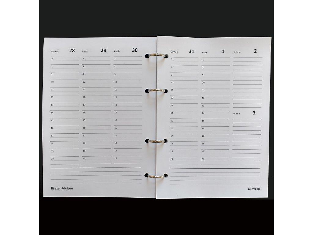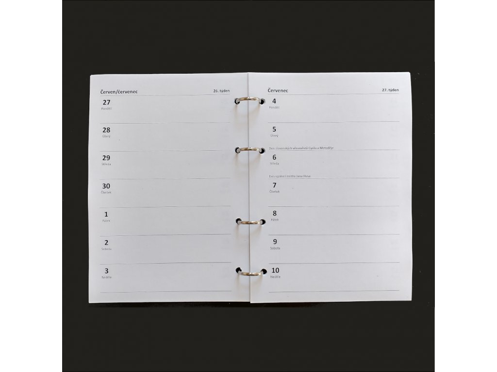 - řádkový (56 stran; 2 týdny = 1 dvojstrana) / sloupcový (108 stran; 1 týden = 1 dvojstrana)